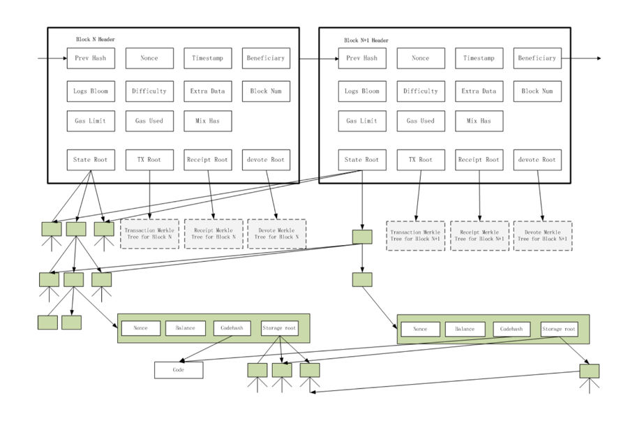 The other is only the authorized machine has the right to generate block, the master nodes is allowed to authorize or unauthorized the machine, so these extra voting will be recorded within the header extra-data. And it’s to only download the chain of block headers and verify their validity, after which point an arbitrary recent state may be downloaded from the network and checked against recent headers. By doing this, it can reduce the block generation difficulty and mantainence cost. This consensus algorithm is called Clique in Ethereum network.