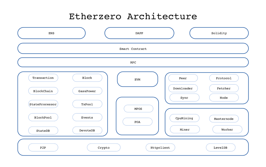 After studying the current mainstream public chain technology, EtherZero team proposed an innovative consensus algorithm called MPos, which is the abbreviation of Masternode + PoS. MPoS algorithm implements what the current mainstream public chain are achieving, such as zero transaction fees and community autonomy. The following picture shows the main framework of the